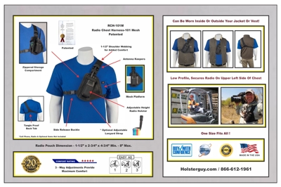 The Radio Chest Harness, RCH-101M Radio Chest Harness is a low profile two way radio carrying solution. Has three torso adjustment tabs to provide maximum comfort