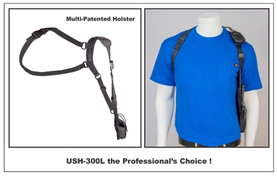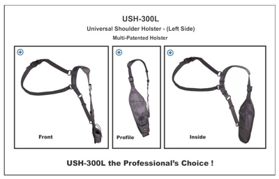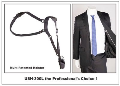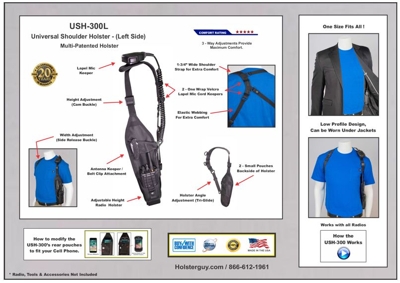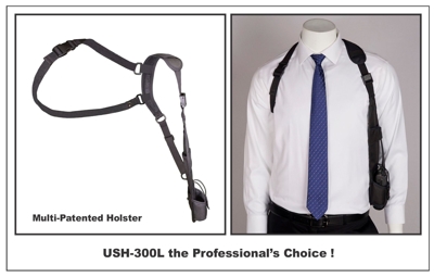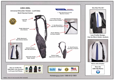 The Universal Shoulder Holster, USH-300L shown above is an exceptional radio shoulder holster for individuals that must carry a two way radio at all times. Designed to be a low profile holster that keeps your radio close, but out of the way under the arm. |