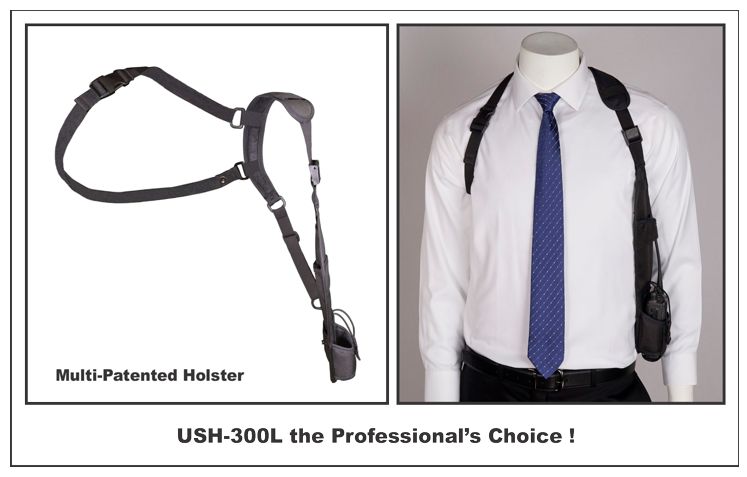 The USH-300L shown above is an exceptional radio shoulder holster for individuals that must carry a two way radio at all times. Designed to be a low profile holster that keeps your radio close, but out of the way under the arm.